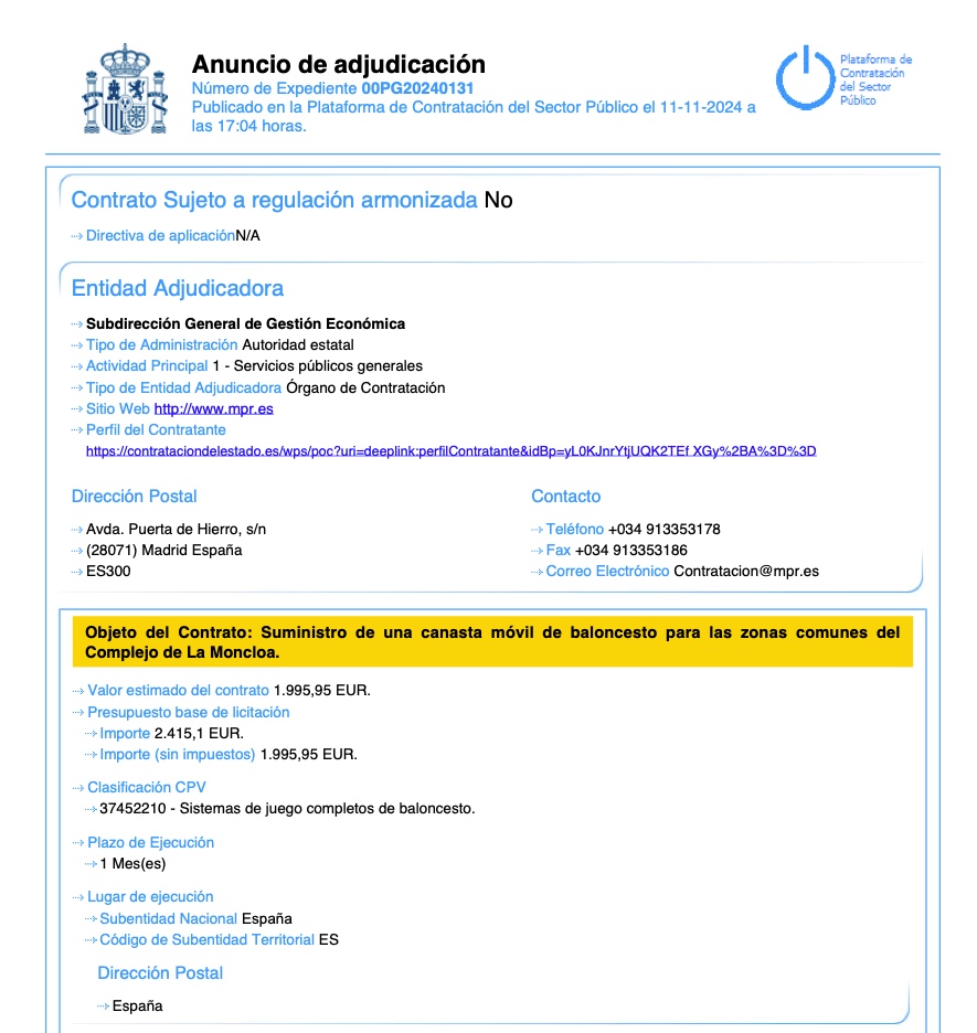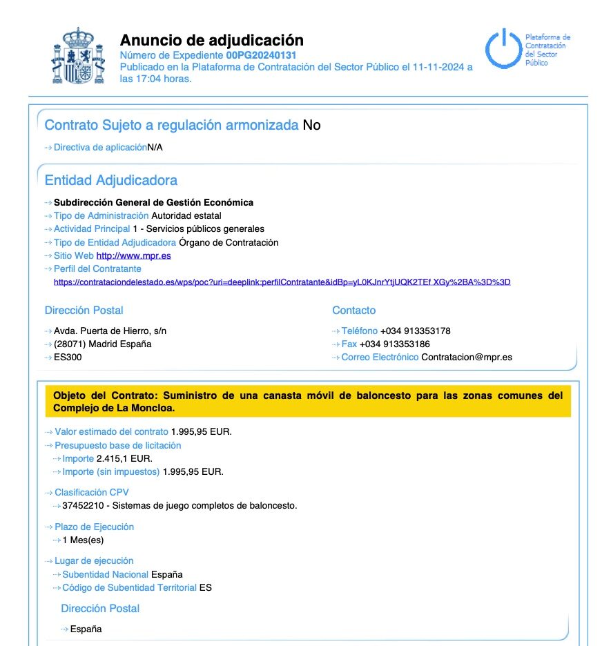 La "Entidad Adjudicadora" es la "Subdirección General de Gestión Económica. Tipo de Administración Autoridad estatal". El área es el de "Servicios públicos generales". Y el "Objeto del Contrato: Suministro de una canasta móvil de baloncesto para las zonas comunes del Complejo de La Moncloa".