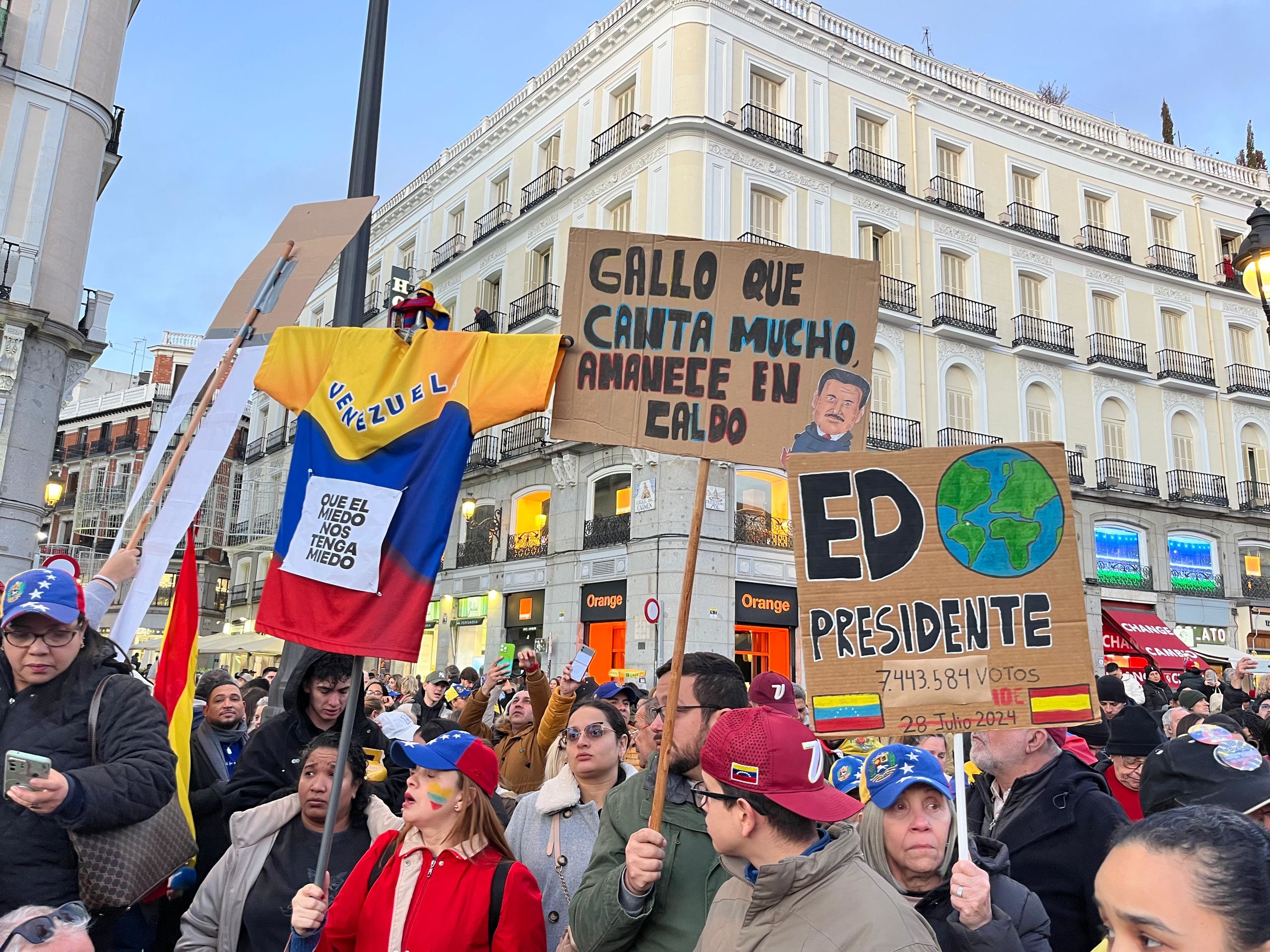 Cientos de manifestantes se agolpan en la Puerta del Sol en favor a la oposición democrática venezolana.