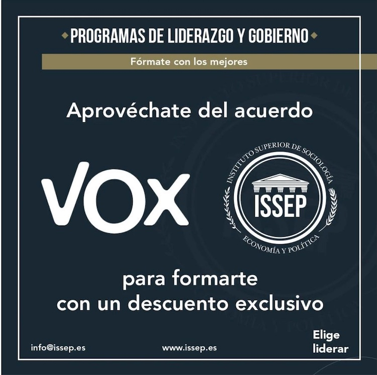 El interés de Vox en formar a sus cuadros por medio de ISSEP es tan expreso que se ha puesto en contacto con sus bases para hacerles la siguiente indicación: "Con motivo de la apertura del proceso de selección de los Programas de Liderazgo y Gobierno de ISSEP previstos para el curso 2025/2026, este instituto de formación ha acordado considerar como colectivo a todos los afiliados de VOX, así como a sus cargos electos y a sus trabajadores, con el fin de que puedas beneficiarte de condiciones muy especiales: descuento del 10%, facilidades de pago y financiación sin coste".