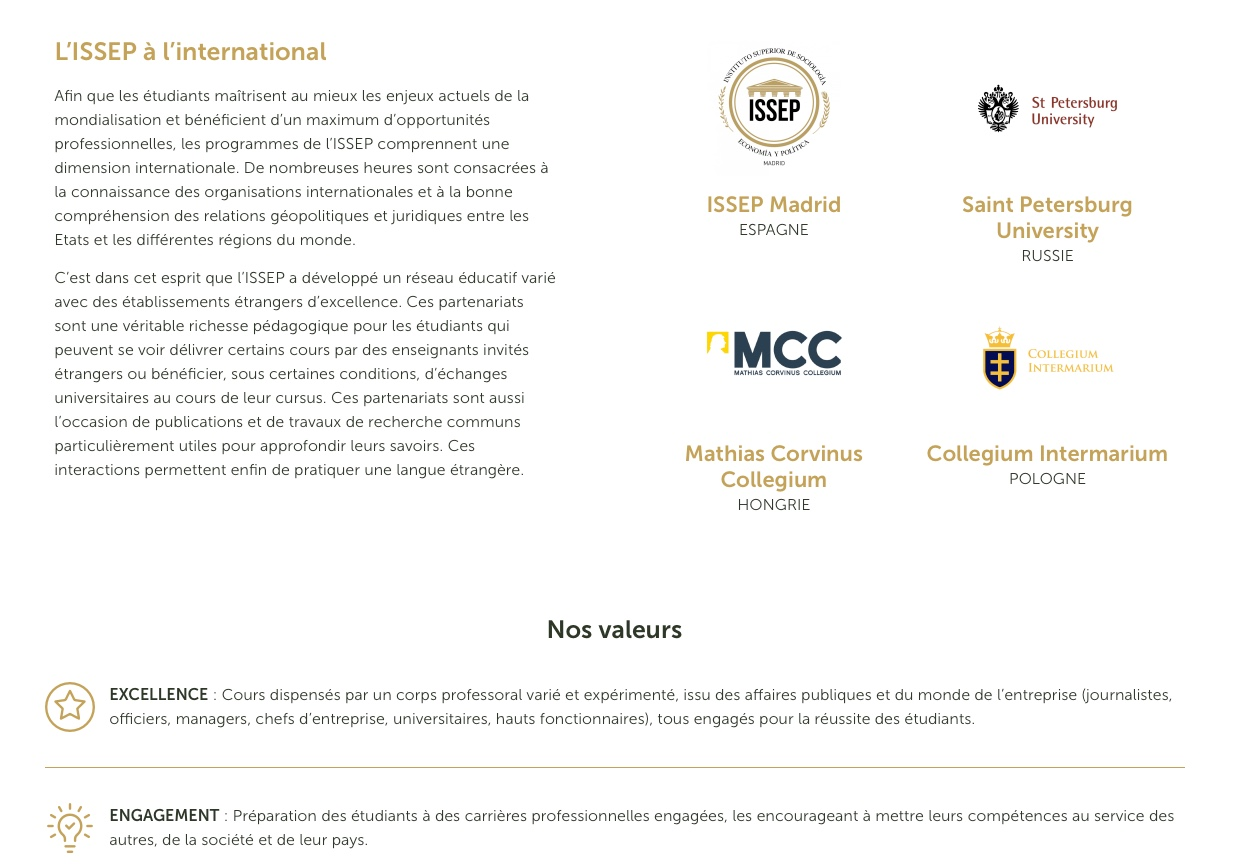 "Es con este espíritu que el ISSEP ha desarrollado una variada red educativa con establecimientos extranjeros de excelencia. Estas asociaciones constituyen una verdadera ventaja educativa para los estudiantes, que pueden recibir determinadas enseñanzas de profesores invitados extranjeros o beneficiarse, bajo determinadas condiciones, de intercambios universitarios durante sus estudios. Estas asociaciones son también una oportunidad para publicaciones y trabajos de investigación conjuntos que resultan especialmente útiles para profundizar sus conocimientos. Estas interacciones finalmente te permiten practicar un idioma extranjero". Por ejemplo, el ruso.
