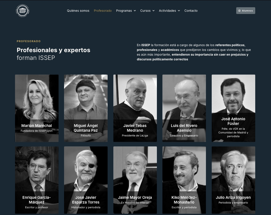 ISSEP se ofrece afirmadlo que "la formación está a cargo de algunos de los referentes políticos, profesionales y académicos que predijeron los cambios que vivimos y, lo que es aún más importante, entendieron su importancia sin caer en prejuicios y discursos políticamente correctos". Ahí es donde aparecen la nieta de Le Pen, Ariza o Kiko Méndez Monasterio, por citar algunos.