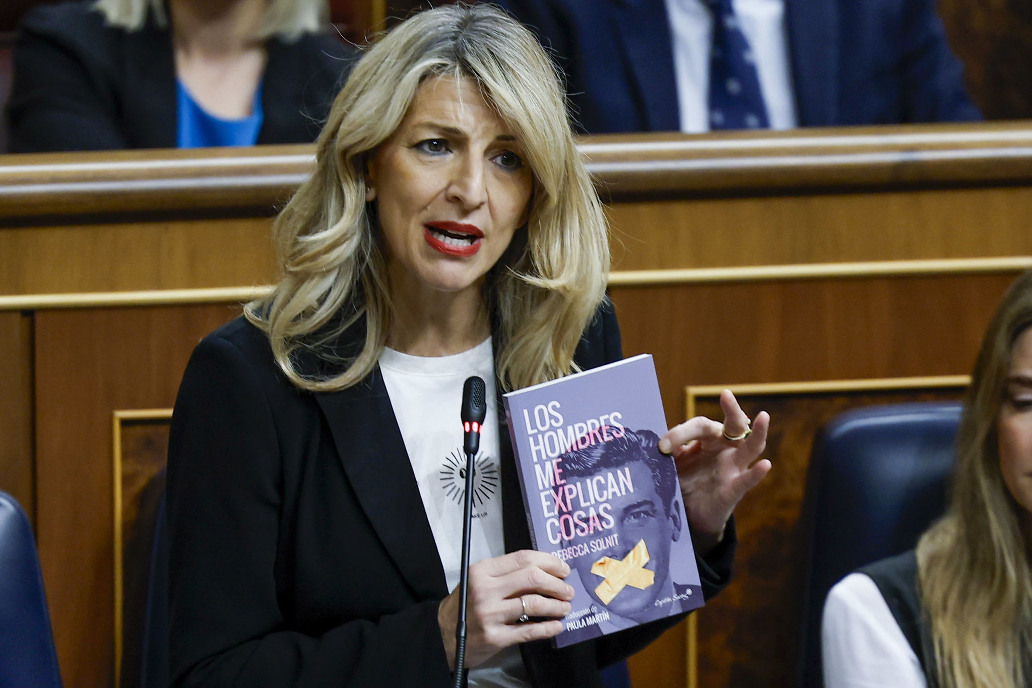 Ajena a todo lo que la rodeaba Yolanda Díaz ha seguido dirigiéndose a Feijóo y le ha recomendado el libro ‘Los hombres me explican cosas’, para acto seguido decirle, ante el rostro un tanto atónito de un Feijóo al que casi le entraba la risa, que "ninguna lección de feminismo", una afirmación un tanto aventurada de la líder de un partido cuyo portavoz parlamentario ha tenido que abandonar la política por un comportamiento inapropiado con las mujeres que él mismo ha admitido.