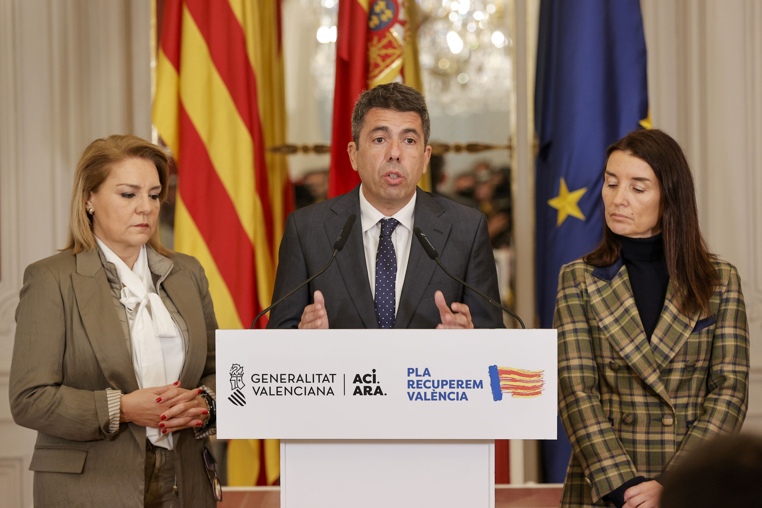 Carlos Mazón ha comparecido desde el Palacio de la Generalidad valenciana para ofrecer una declaración institucional de más de media hora, en la que ha explicado el acuerdo alcanzado con Vox, aunque sin detallar medidas concretas, más allá de hacer una defensa de la lengua española, los agricultores, la rebaja fiscal o el rechazo a la inmigración ilegal, rechazando especialmente el Pacto Verde europeo y la llegada de menas.