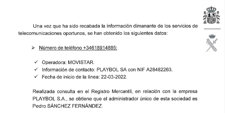 La UCO destaca que, "realizada consulta en el Registro Mercantil, en relación con la empresa PLAYBOL S.A., se obtiene que el administrador único de esta sociedad es Pedro Sánchez Fernández". El padre de los Sánchez y, por lo tanto, del presidente del Gobierno.