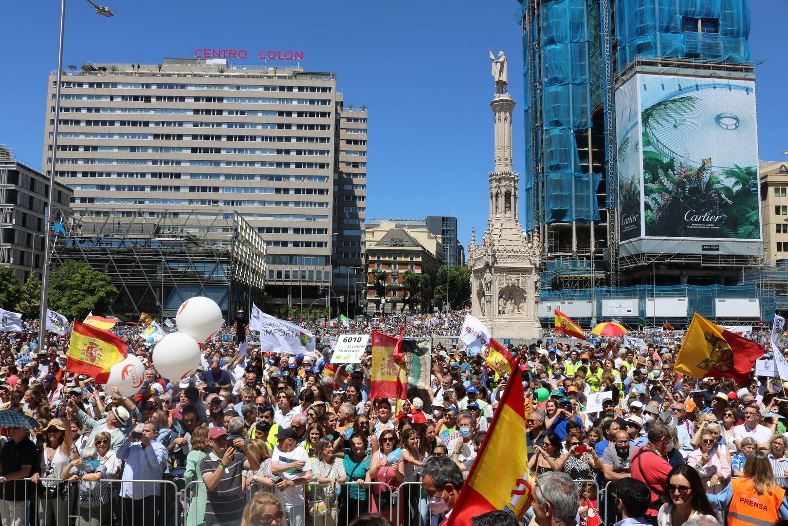 Un centenar de asociaciones, entre las que se encuentran Unión 78, Pie en Pared o Neos, han convocado a los españoles este sábado a mediodía, en la madrileña Plaza de Colón, para protestar contra el Gobierno de Pedro Sánchez. Bajo el lema ‘Por la dignidad de España: Sánchez dimisión, elecciones ya", exigen la dimisión de Pedro Sánchez y la convocatoria inmediata de comicios para dar fin a una legislatura moribunda en la que el Gobierno está acorralado por la corrupción, escándalos como el del apagón o el caos ferroviario y su debilidad parlamentaria.