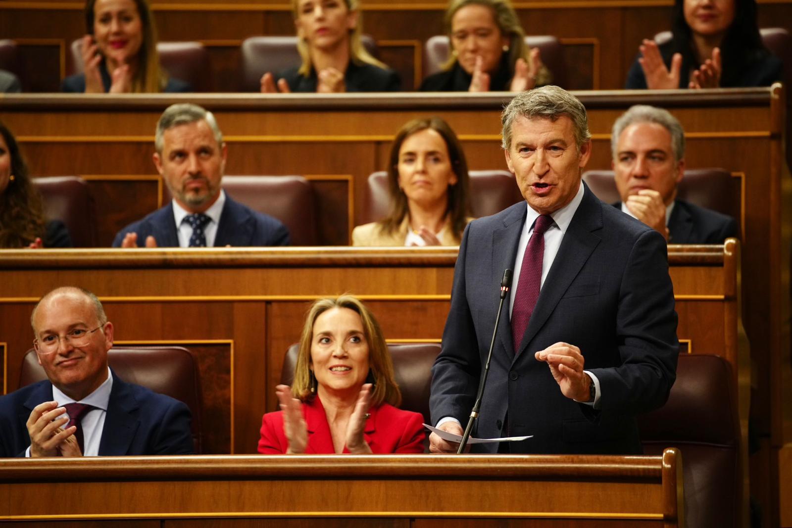 "De la cara ante los españoles, diga la verdad por una vez y actúe con la dignidad que se merece nuestra nación", ha apelado Feijóo directamente a Sánchez en su intervención: