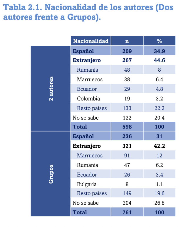 En cuanto a las nacionalidades extranjeras más reincidentes, el que lidera la lista es Marruecos con 129 casos (9,5% del total), Rumanía: 95 casos (7%) y Ecuador: 55 casos (4%). Además, Argelia, Bulgaria y Colombia, tienen cifras menores pero relevantes. Pero, el caso marroquí es el más significativo: representan solo el 2,24% de la población española, pero están implicados en el 9,5% de las violaciones en grupo.