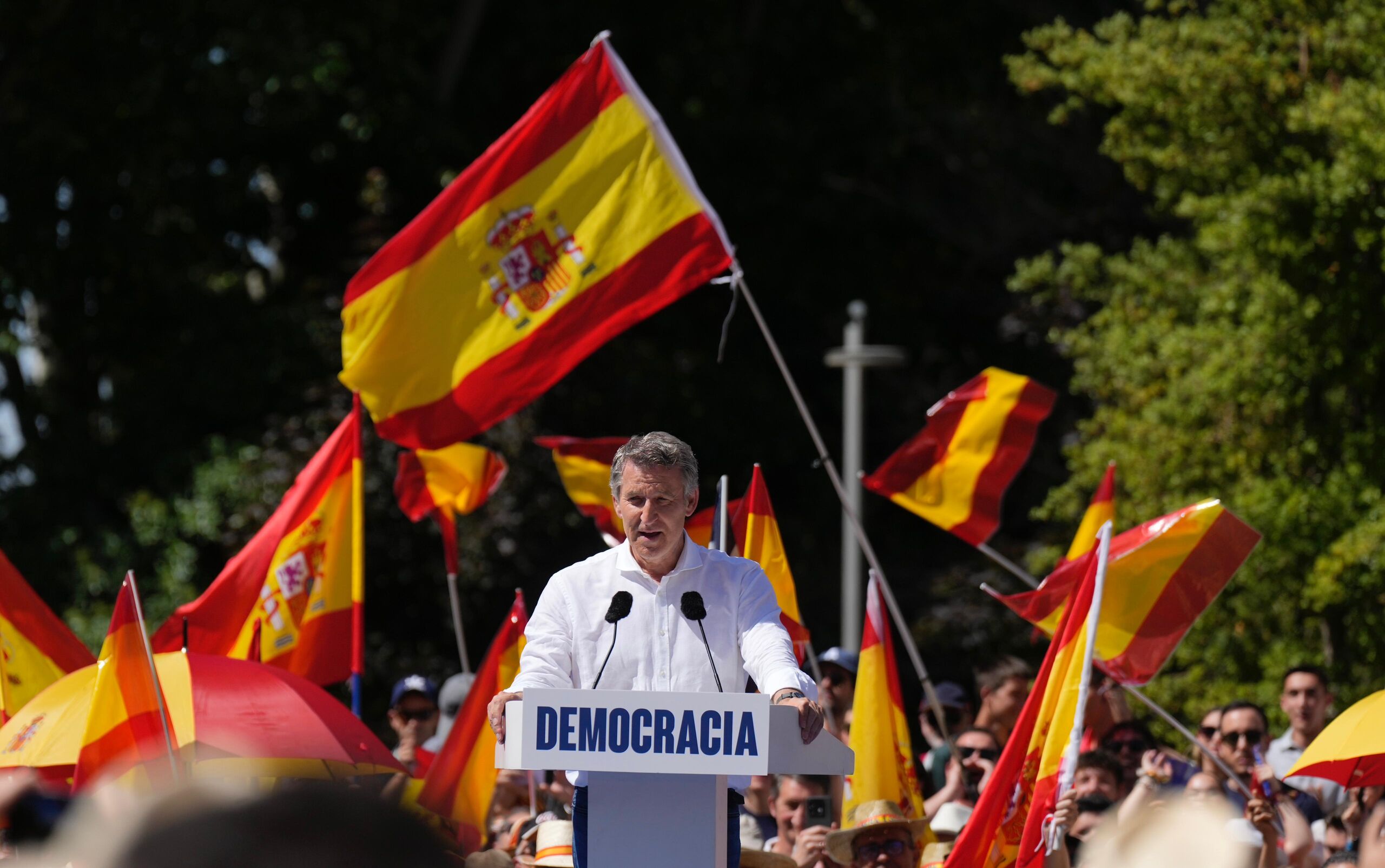 El líder del PP, Alberto Núñez Feijóo, ha llamado este domingo a los españoles a "no callar" y "rebelarse contra la degradación" del actual Gobierno a través de "una revolución de la decencia y de la libertad" en las calles hasta que haya elecciones. De hecho, ha retado al jefe del Ejecutivo, Pedro Sánchez, a tener el "coraje" de ir a las urnas, al tiempo que le ha pedido que deje de "esconderse" y de "huir" ante los casos de presunta corrupción que se están conociendo.