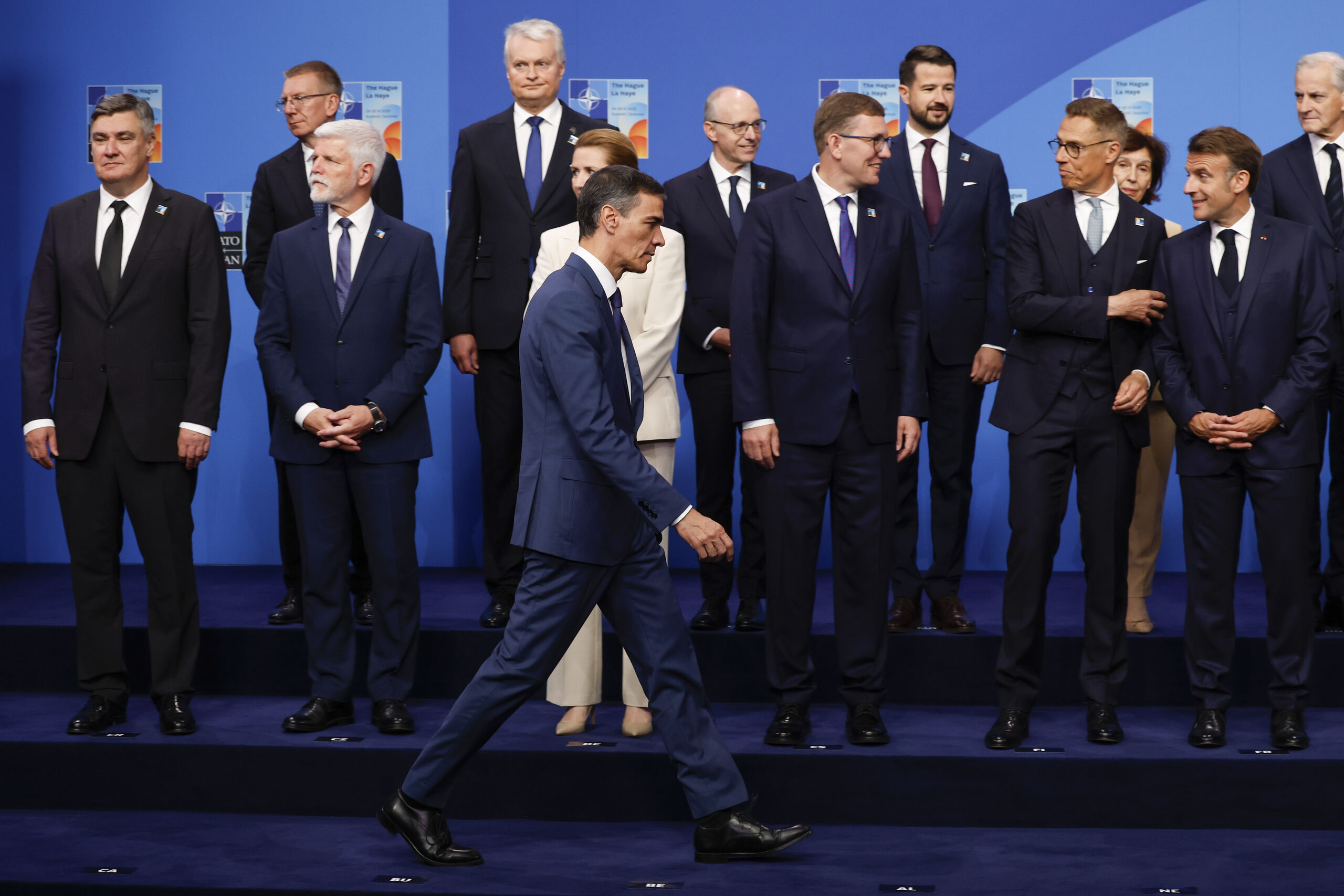 La imagen de Sánchez apartado de sus aliados evidencia su aislamiento internacional pero se trata de una foto buscada que debe interpretarse en clave interna, con la vista puesta en sus socios de Gobierno, a los que les ha dado una causa común para aglutinarse de nuevo en torno a él. El vídeo que muestra la escena para hacer la foto de familia evidencia cómo el presidente se coloca de forma deliberada más alejado del resto de líderes, al situarse en uno de los extremos de la fila. No se trata de algo casual o forzado por los demás mandatarios.