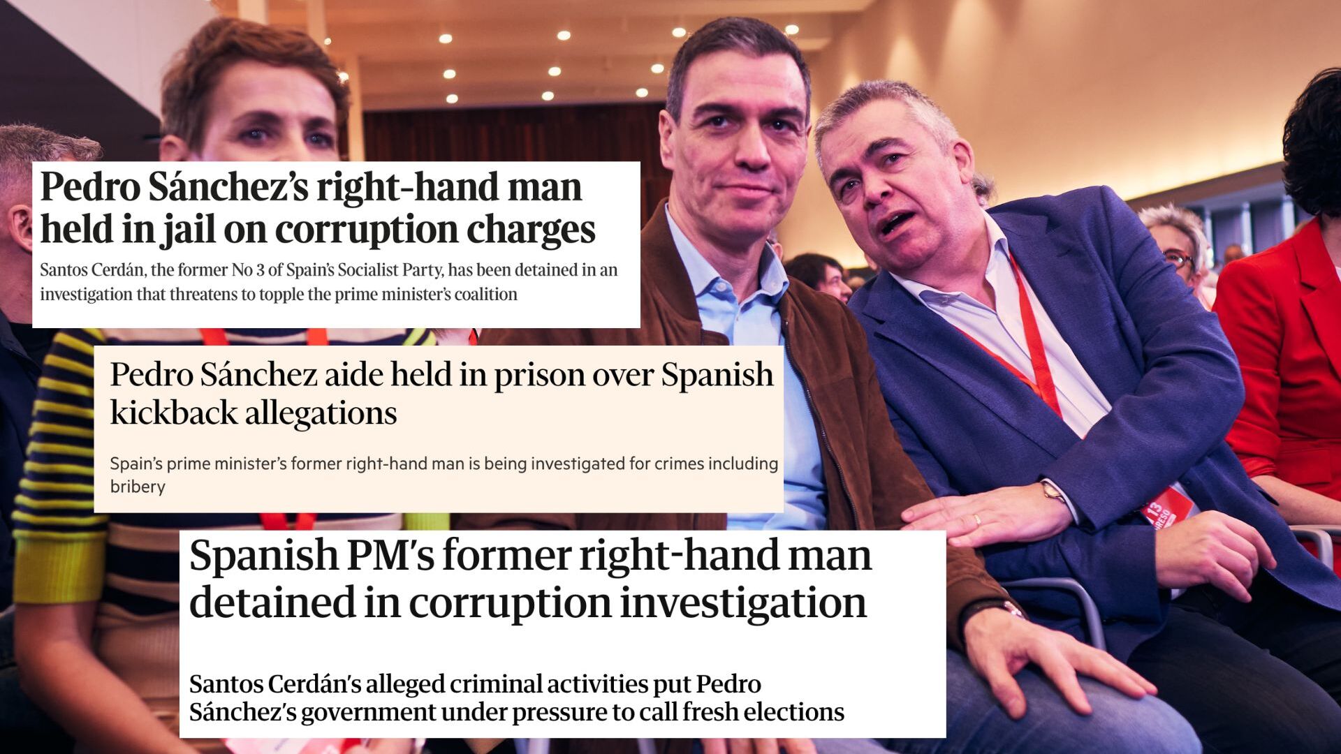 Por su parte, el periódico anglosajón The Times destaca en su noticia "La mano derecha de Pedro Sánchez, en prisión por cargos de corrupción" que la detención del "número tres" del PSOE "amenaza con hacer caer la coalición de Gobierno". En concreto, enmarca la detención de Cerdán "en una investigación más amplia" que podría sentenciar al Ejecutivo de Pedro Sánchez, del que también su "exmano derecha", José Luis Ábalos, se encuentra imputado en la misma trama, que habría cobrado mordidas por la adjudicación de contratos de obra pública "por valor de 500 millones de euros".