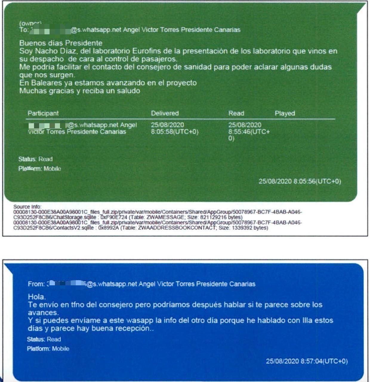 Días más tarde, Ignacio Díaz estaba citado en el Ministerio de Transportes, éste envía un mensaje al Presidente de Canarias, en el cual se presenta recordándole que estuvo en la presentación que se hizo en su despacho y le pide el contacto del Consejero de Sanidad, asimismo, le informa que en Baleares están avanzando en el proyecto. Víctor Torres le facilita el contacto solicitado, pero le pide hablar con él sobre los avances, también le pide que le envíe la información que le había facilitado anteriormente, añadiendo que ha hablado con Salvador Illa, Ministro de Sanidad, y que parece que hay buena recepción".
