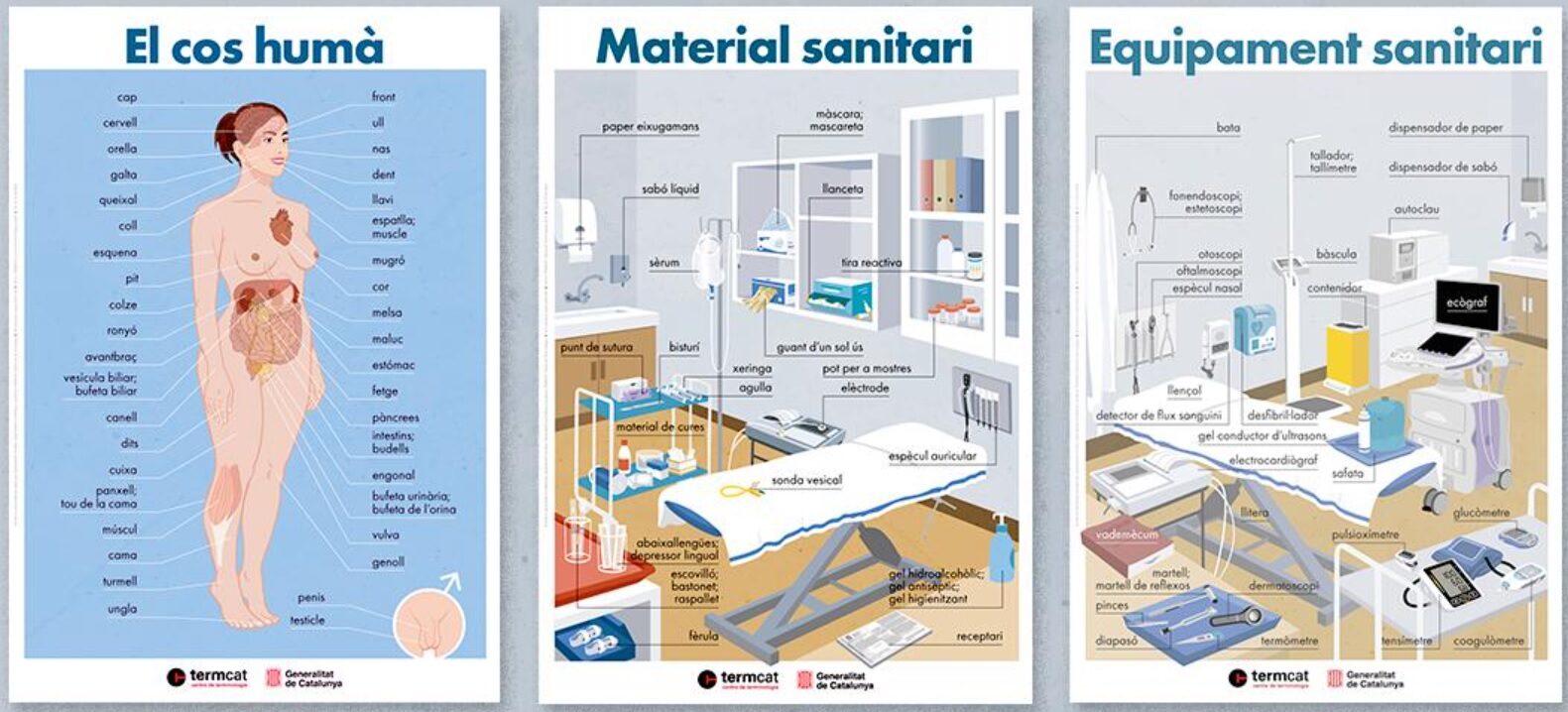 La iniciativa se lleva a cabo con el concurso de una entidad denominada Termcat, creada en 1985 por la consejería de Cultura y el Instituto de Estudios Catalanes. En su página web se explica que el propósito es "favorecer el uso del catalán en entornos sanitarios". A tal efecto han diseñado tres carteles. El primero es el de un cuerpo con los nombres de las principales partes del mismo. El segundo está dedicado al material sanitario, jeringas, suero, lanceta, escobillón, etcétera, etcétera. Y el tercero versa sobre los principales dispositivos y aparatos que pueden encontrarse en una consulta, tales como una litera, un termómetro o un glucómetro.