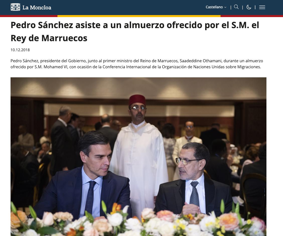 El 10 de diciembre, nueva gestión presidencial: "Pedro Sánchez, presidente del Gobierno, junto al primer ministro del Reino de Marruecos, Saadeddine El Othmani, durante un almuerzo ofrecido por S.M. Mohamed VI, con ocasión de la Conferencia Internacional de la Organización de Naciones Unidas sobre Migraciones".