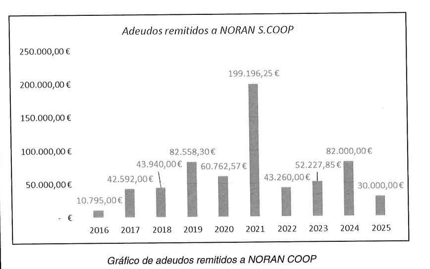 "Realizando el sumatorio de las cantidades mostradas, la cifra total adeudada desde cuentas de Servinabar a cuentas de Noran Coop, entre 2016 y 2025, asciende a 647.331,97 € . Atendiendo a la información bancaria de Noran Coop, estos pagos suponen el 67,81% de los fondos ingresados en cuentas de ésta", añade la UCO.