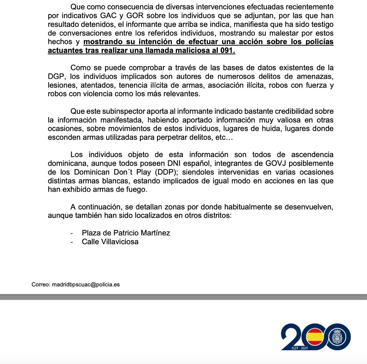 El documento en cuestión señala que "se tiene conocimiento de una información relevante conseguida por un informante, la cual es trasladada a los policías adscritos al GAC-Latina de este turno". Esa información afirma que "como consecuencia de diversas intervenciones efectuadas recientemente por indicativos GAC y GOR sobre los individuos que se adjuntan, por las que han resultado detenidos, el informante que arriba se indica, manifiesta que ha sido testigo de conversaciones entre los referidos individuos, mostrando su malestar por estos hechos y mostrando su intención de efectuar una acción sobre los policías actuantes tras realizar una llamada maliciosa al 091".