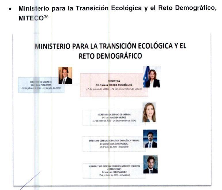 -Secretaría de Estado de Energía. • Sara Aagesen Muñoz, ostentó el cargo el periodo que abarca desde el 17 de enero de 2020 hasta el 24 de noviembre de 2024. -Dirección General de Política Energética y Minas, DGPEM. • Manuel García Hernández, ostenta el cargo desde el 9 de junio de 2020. -Subdirector General de Hidrocarburos y Nuevos Combustibles, SGH. • José Luis Cabo Sánchez, ostenta el cargo desde el 7 de octubre de 2021. -Jefa Área de Hidrocarburos Líquidos. Ana Belén Manzano Negro."