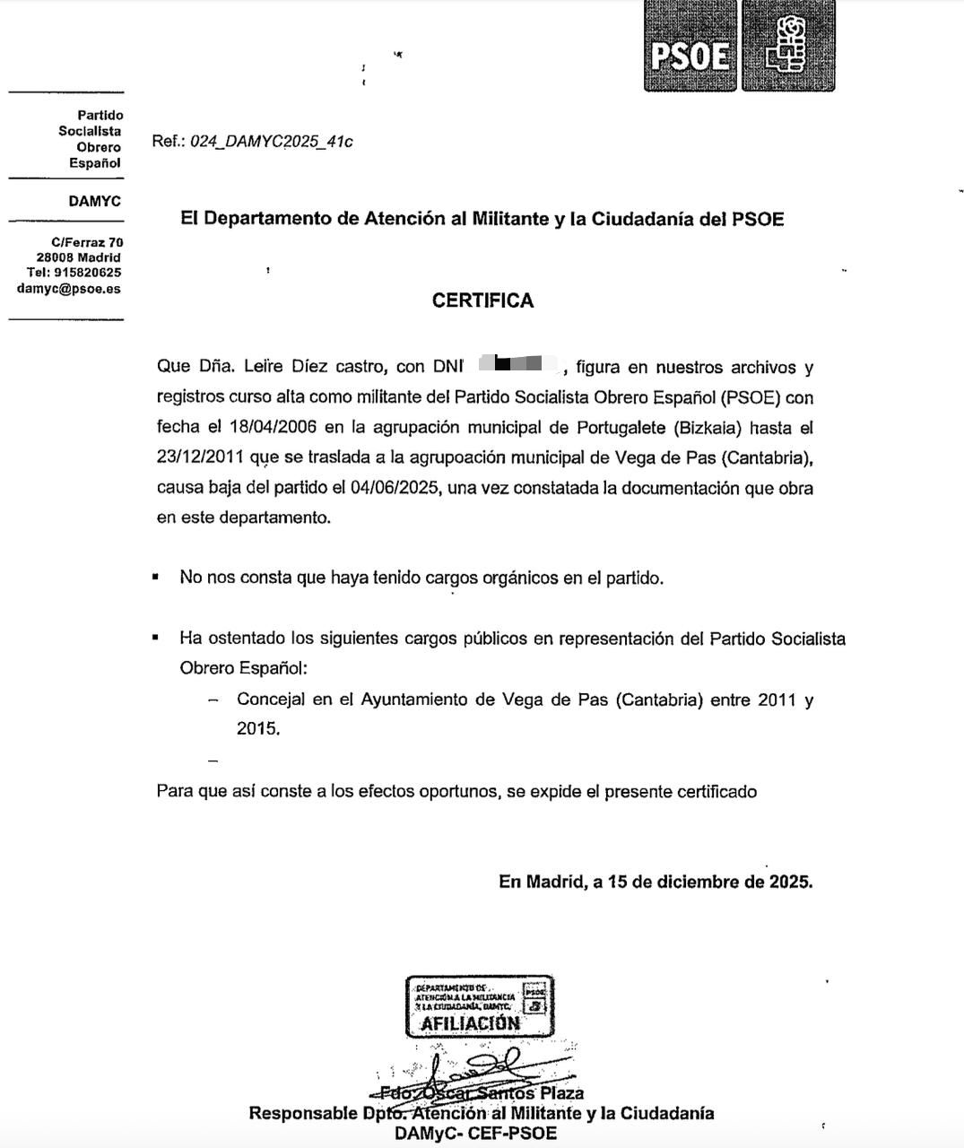 "Respecto de Doña María Leire Díez Castro, se adjunta certificado acreditativo de la fecha de alta y cese de afiliación de esta en el PSOE, señalado como documento nº 2, en el que se aprecia que la misma figura dada de alta como afiliada en fecha 18 de abril de 2006 en la agrupación de Portugalete (Bizkaia) y más tarde en la agrupación de Vega de Pas (Cantabria) y causando baja en fecha 4 de junio de 2025", señala ese documento con respecto a la afiliación.