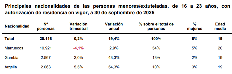 A 30 de junio de 2021, del total de menores no acompañados o jóvenes extutelados de 16 a 23 años con autorización de residencia en vigor, el 27% (2.158) pertenecía a la franja de edad de 16 y 17 años. Sin embargo, a 30 de septiembre de 2025 el 17% (3.510 personas) pertenecía a esa franja.