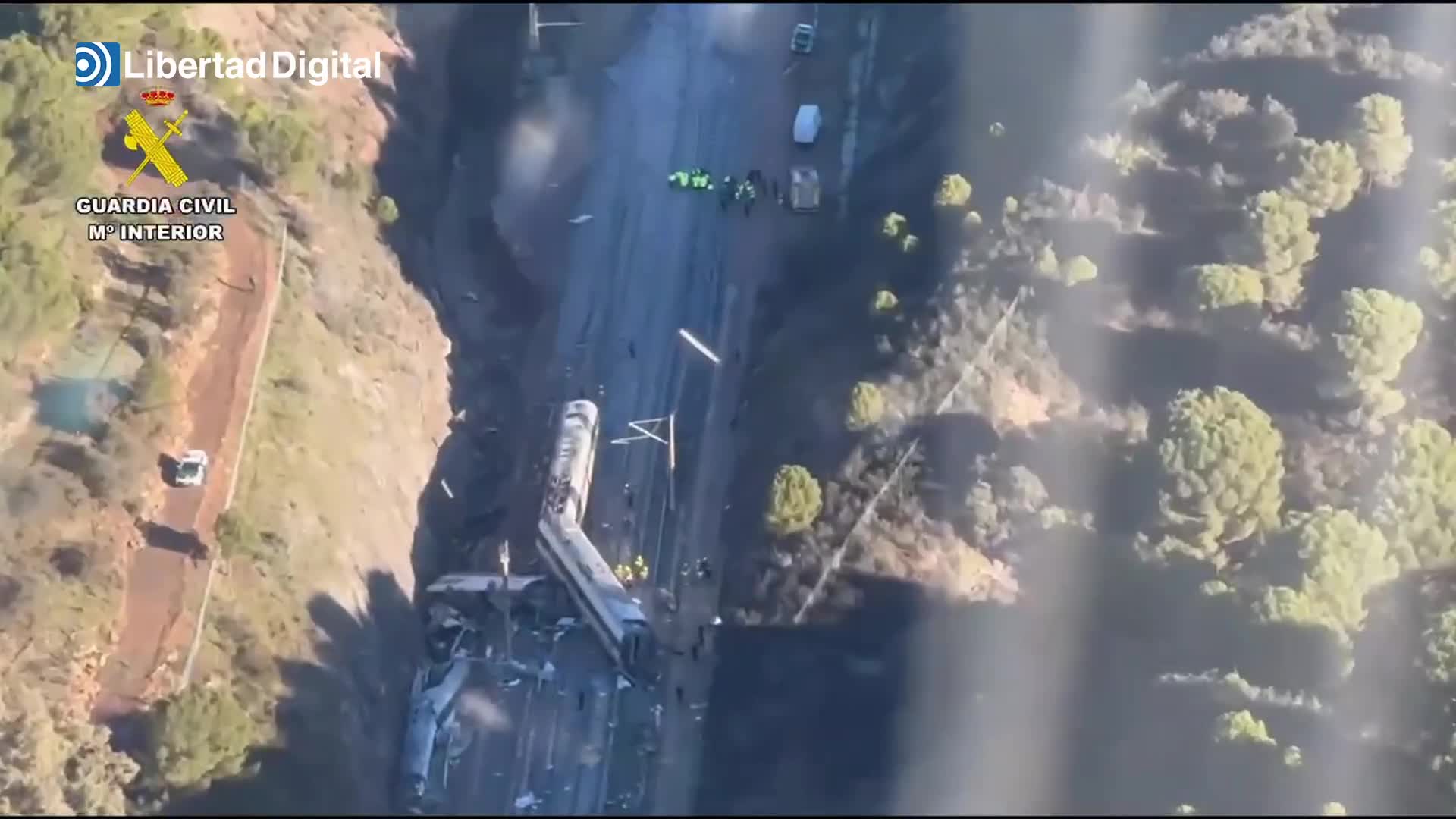 En el vídeo se observa el accidente ferroviario en Adamuz desde una impactante toma aérea, que permite apreciar con claridad la magnitud del suceso y el entorno en el que se produjo. Las imágenes muestran el trazado de la vía férrea atravesando una zona rural, donde varios vagones han quedado descarrilados y fuera de su posición habitual. Desde el aire se distinguen los daños en la infraestructura, así como la dispersión de los trenes a lo largo de la vía, lo que evidencia la fuerza del accidente.