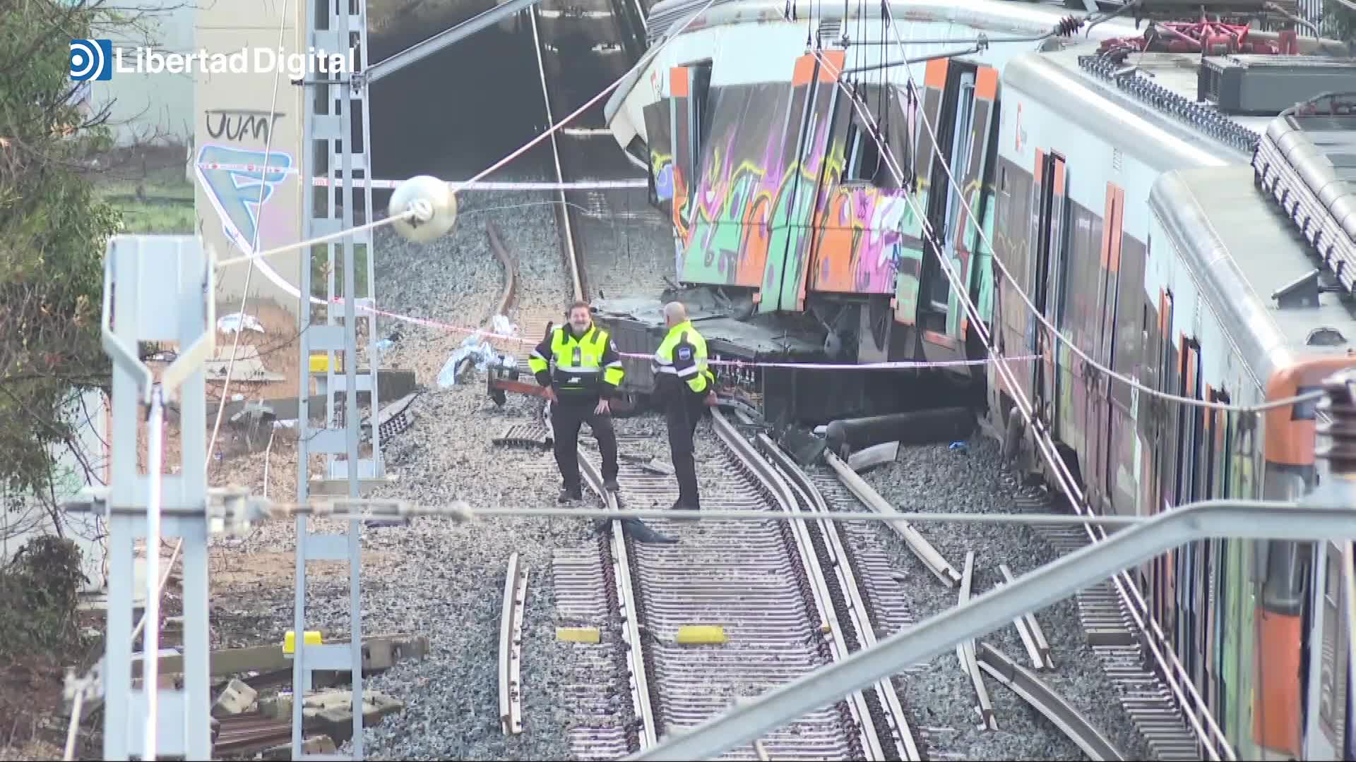 Imágenes del descarrilamiento de un tren de la línea R4 de Rodalies este martes por la noche en Gelida (Barcelona), que ha causado un muerto- el maquinista-, cinco heridos graves, seis menos graves y 26 leves, según ha informado Protecció Civil. El tren ha descarrilado tras la caída de un muro de contención.