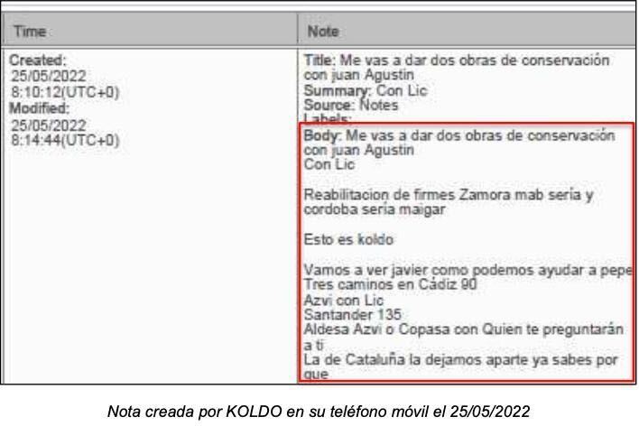 Es en ese momento cuando la UCO señala que, "de hecho, en su teléfono móvil se han localizado anotaciones en las que se apuntan indicaciones para la adjudicación de obras públicas". Y explica la UCO: "Es importante destacar que existe la posibilidad de crear notas compartidas entre varios usuarios, reflejándose en todos los dispositivos habilitados las ediciones que se realicen sobre la misma. Así, esta modalidad permite intercambiar mensajes sin que quede registro de la conversación, por cuanto el contenido de la nota puede ser borrado o editado en cualquier momento".
