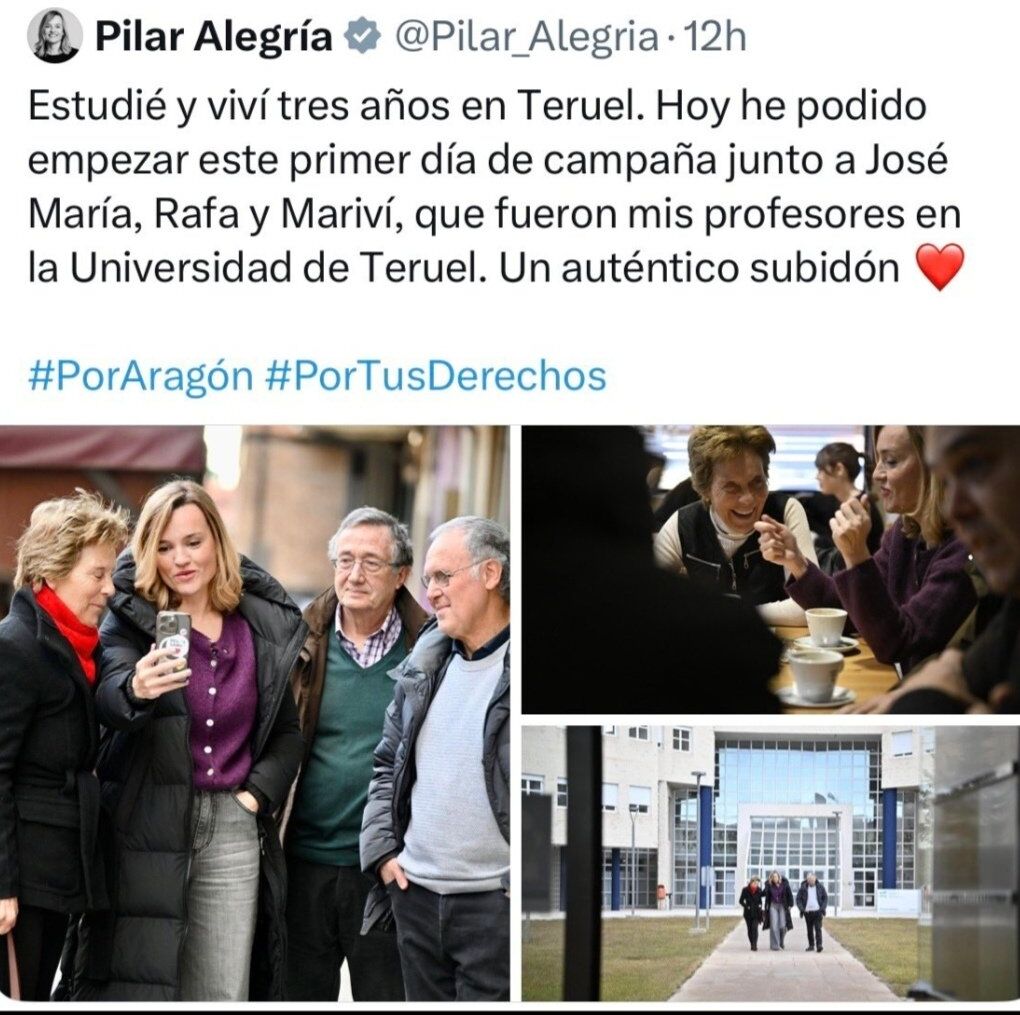 Pilar Alegría, ministra de Educación durante cuatro años (2021-2025) en el Gobierno de Pedro Sánchez y ahora candidata del PSOE en las elecciones de Aragón, afirmó este fin de semana que estudió en la Universidad de Teruel, la cual no existe, ya que se trata de un campus de la Universidad de Zaragoza que hay en dicha ciudad. Las críticas no han tardado en llegar y la exministra se ha visto obligada a borrar su publicación en X (antes Twitter).