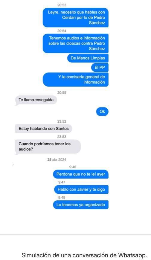 "Leire, necesito que hables con Cerdán por lo de Pedro Sánchez", afirmó en el primer mensaje del día 24 de abril, previo a la reunión. "Tenemos audios e información sobre las cloacas contra Pedro Sánchez", aseguró el segundo de esos comentarios. Y puntualizó: "De Manos Limpias", del "PP" y de "la Comisaría General de Información". Todo ello el mismo día 24 de abril.