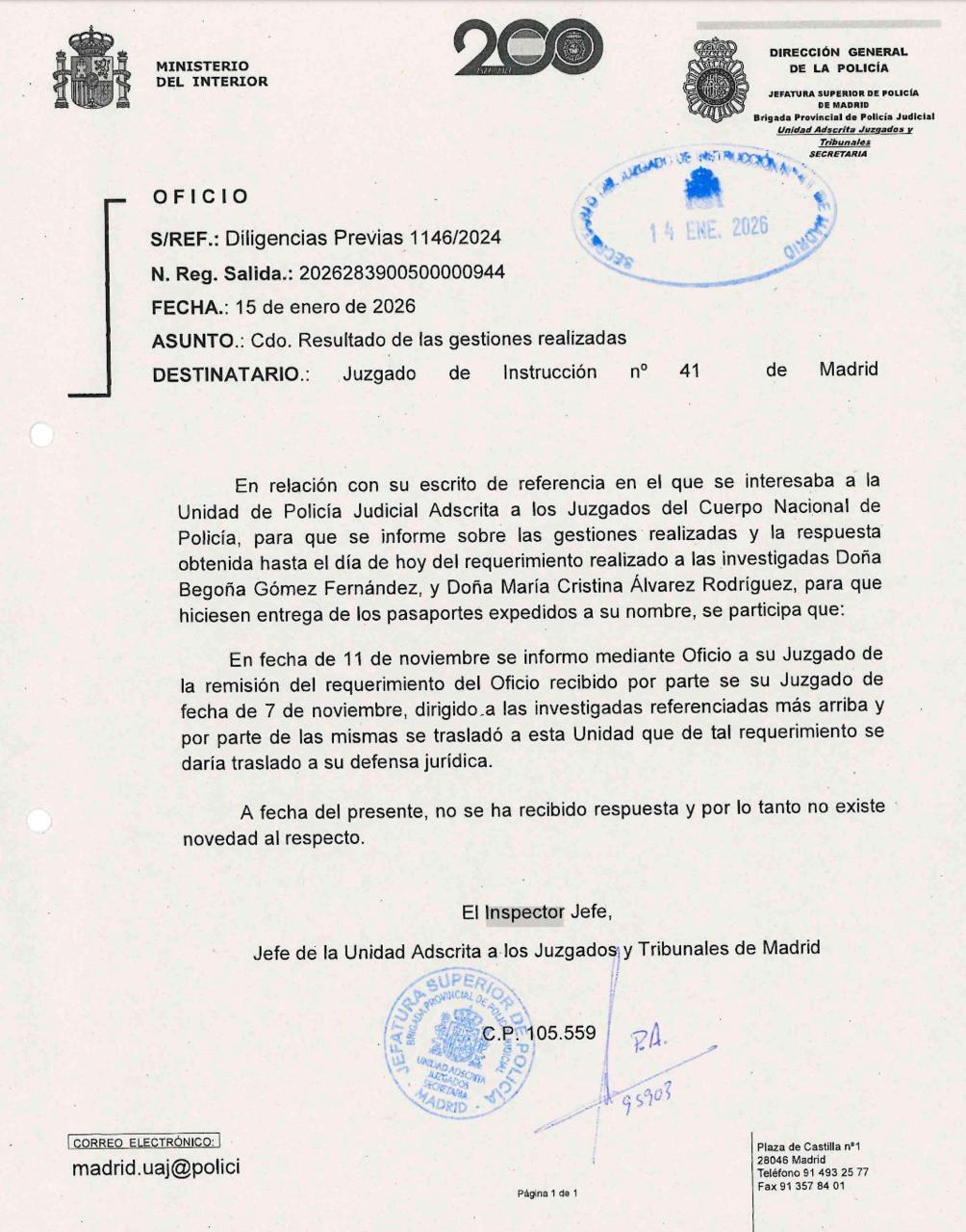 "En relación con su escrito de referencia en el que se interesaba a la Unidad de Policía Judicial Adscrita a los Juzgados del Cuerpo Nacional de Policía, para que se informe sobre las gestiones realizadas y la respuesta obtenida hasta el día de hoy del requerimiento realizado a las investigadas Doña Begoña Gómez Fernández, y Doña María Cristina Álvarez Rodríguez, para que hiciesen entrega de los pasaportes expedidos a su nombre, se participa que": "En fecha de 11 de noviembre se informó mediante Oficio a su Juzgado de la remisión del requerimiento del Oficio recibido por parte de su Juzgado de fecha de 7 de noviembre, dirigido a las investigadas referenciadas más arriba y por parte de las mismas se trasladó a esta Unidad que de tal requerimiento se daría traslado a su defensa jurídica. A fecha del presente, no se ha recibido respuesta y por lo tanto no existe novedad al respecto". Traducido: bloqueo pleno.