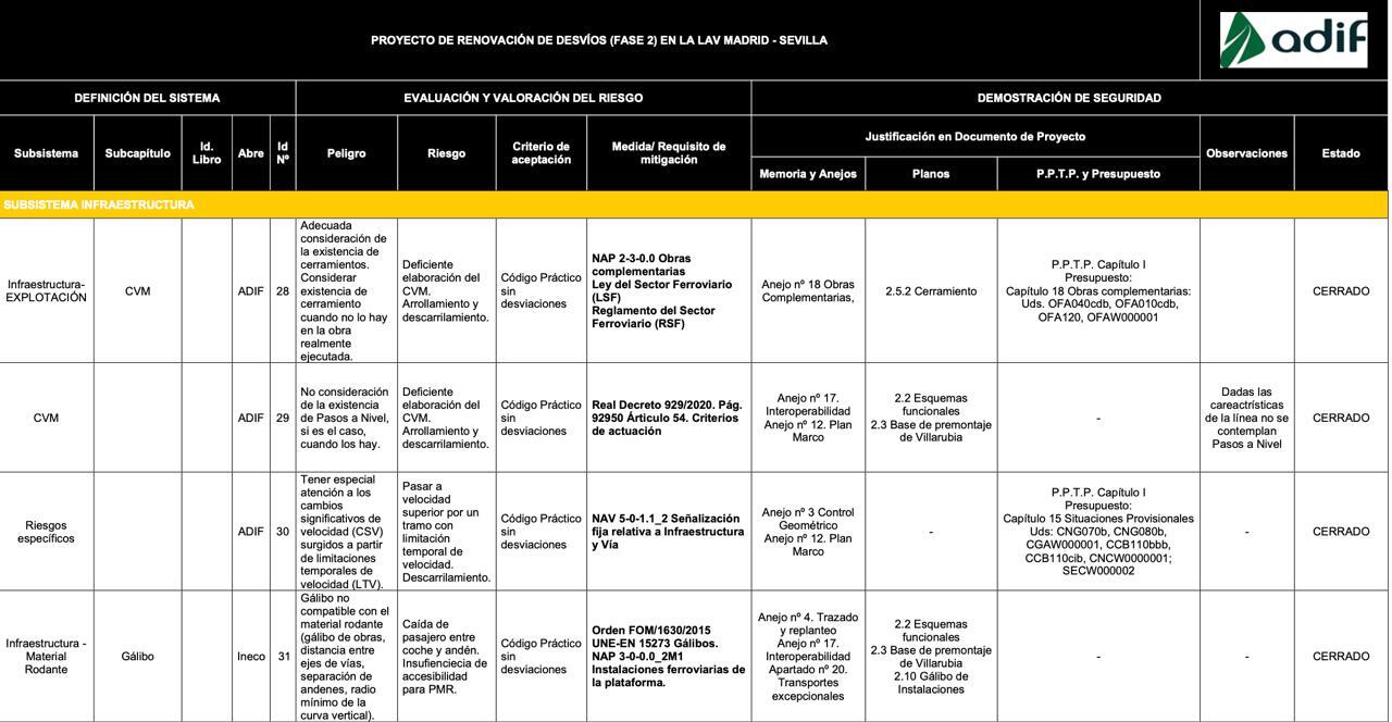 Los documentos que hoy muestra Libertad Digital forman parte del "Apéndice 1. Registro específico de peligros" del "Estudio previo de seguridad" sobre el "Proyecto de renovación de desvíos (fase 2) en la LAV Madrid-Sevilla". LAV es la línea de alta velocidad.