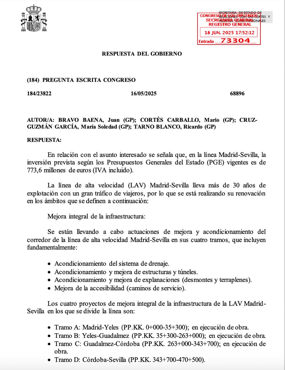 Dos, la "renovación de desvíos, por importe de 26,86 millones. Incluía la sustitución de los desvíos de Adamuz, que se renovaron en mayo/junio de 2025 entrando en servicio el 20 de junio" y, tres, la "implantación del ERTMS por importe de 104,72 millones de euros, actualmente en ejecución, siguiendo en vigor el sistema LZB".