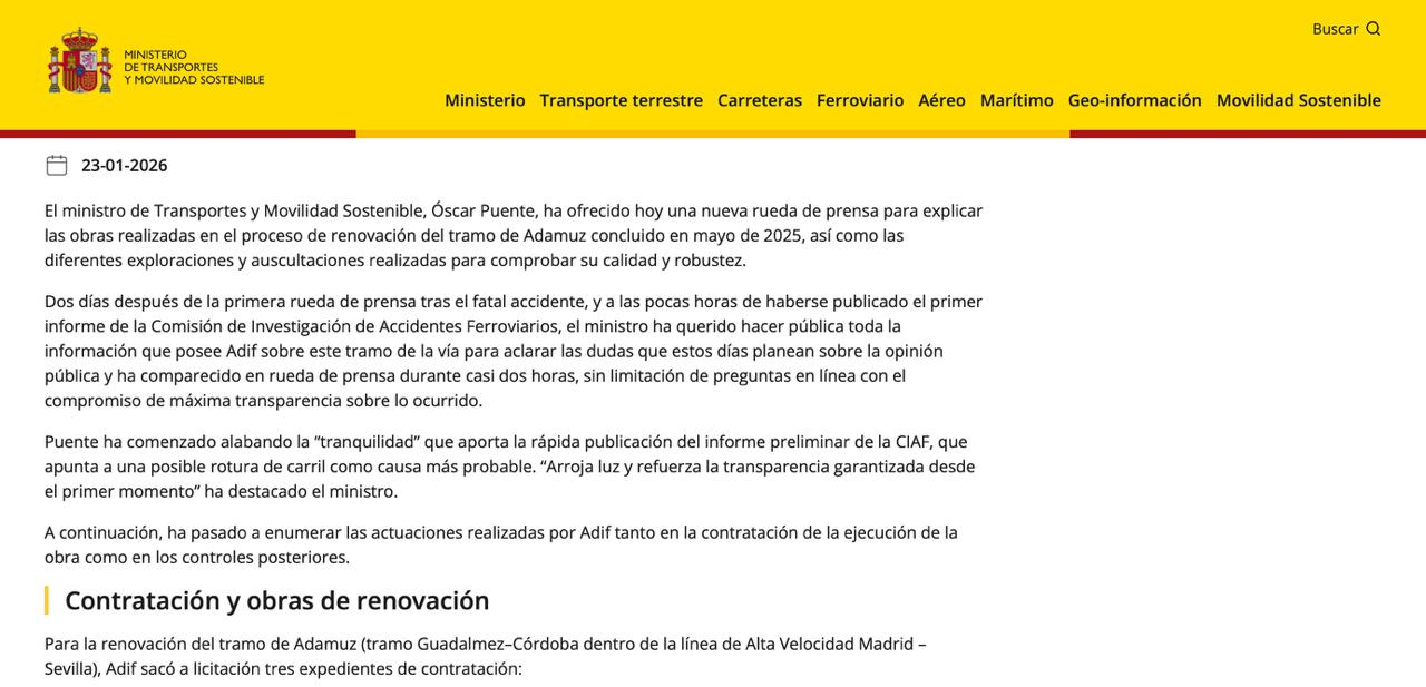 Cinco días después del accidente de Adamuz, el ministro de Transportes y Movilidad Sostenible, Óscar Puente, dio una rueda de prensa para explicar las obras realizadas en el proceso de renovación del tramo de vía en Adamuz y aseguró que se habían concluido en "mayo de 2025". Puente afirmó que para la "renovación del tramo de Adamuz (tramo Guadalmez–Córdoba dentro de la línea de Alta Velocidad Madrid – Sevilla), Adif sacó a licitación tres expedientes de contratación": Uno, la "mejora integral de la infraestructura por 52,49 millones de euros. Incluía la mejora de todos los trabajos de plataforma, y contó posteriormente con un modificado de 6 millones de euros motivado por el mantenimiento del servicio con la realización de la obra. El adjudicatario fue una UTE formada por Ferrovial, OHL, FCC y Azvi, "la flor y nata de la obra pública española", dijo.