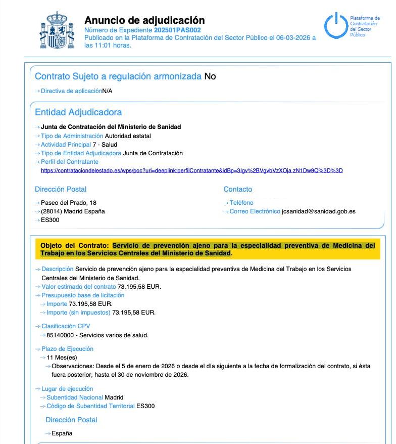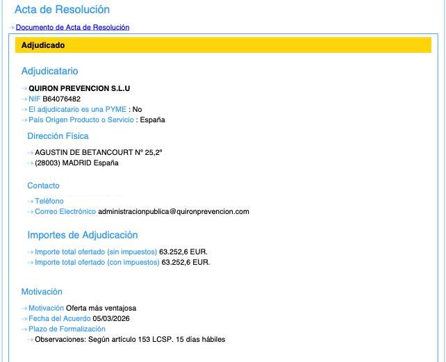 Por todo ello se ha adjudicado, con fecha de 6 de marzo de este año 2026, el "Servicio de prevención ajeno para la especialidad preventiva de Medicina del Trabajo en los Servicios" a Quirón Prevención por una valor total de "63.252,6 EUR". Todo ello "desde el 5 de enero de 2026 o desde el día siguiente a la fecha de formalización del contrato, si ésta fuera posterior, hasta el 30 de noviembre de 2026".