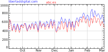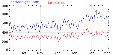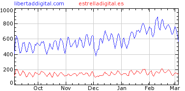 A continuación, les mostramos un gráfico comparativo entre distintos diarios de difusión nacional. El gráfico está elaborado por Alexa, medidor que se encarga de publicar la popularidad de los distintos sitios web de Internet. En todos ellos, Libertad Digital ha ido devorando puestos a lo largo de los últimos meses, desbancando sistemáticamente a sus competidores más directos. Obsérvese, por ejemplo, la contundencia de la disparidad de cifras en el caso concreto de Estrella Digital, diario nacido un poco antes que nuestro periódico.