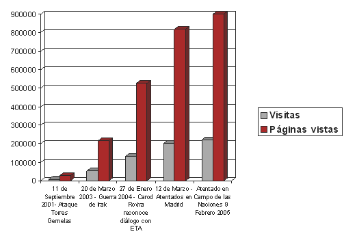 A continuación le mostramos una serie de gráficos que ilustran el crecimiento exponencial de tráfico soportado por Libertad Digital a lo largo de estos cinco años. En primer lugar, les mostramos una comparativa de la repercusión en el número de páginas vistas, de distintas noticias de impacto e interés.