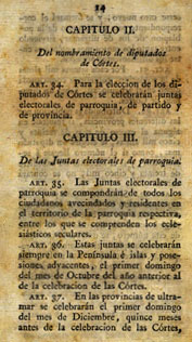 Art. 232. Estos serán precisamente en la forma siguiente, a saber: cuatro eclesiásticos, y no más, de conocida y probada ilustración y merecimiento, de los cuales dos serán obispos; cuatro Grandes de España, y no más, adornados de las virtudes, talento y conocimientos necesarios; y los restantes serán elegidos de entre los sujetos que más se hayan distinguido por su ilustración y conocimientos, o por sus señalados servicios en alguno de los principales ramos de la administración y gobierno del Estado. Las Cortes no podrán proponer para estas plazas a ningún individuo que sea diputado de Cortes al tiempo de hacerse la elección. De los individuos del consejo de Estado, doce a lo menos serán nacidos en las provincias de Ultramar.