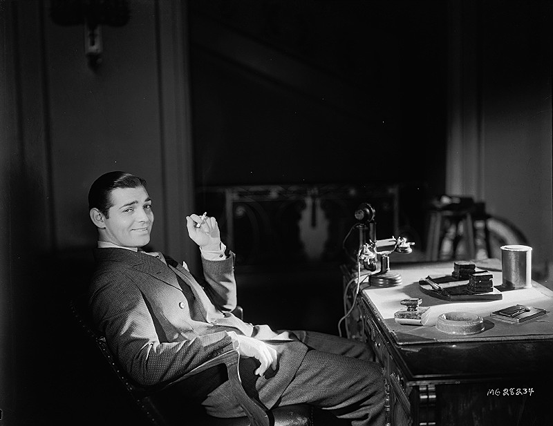 El actor Clark Gable fuma un cigarrillo en su mesa hacia 1932.