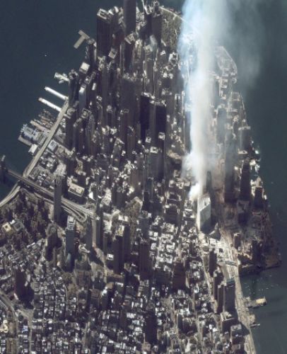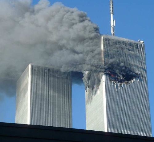 Sobrecogedora panorámica que ofrecían las torres gemelas en llamas justo en el momento de la segunda explosión.