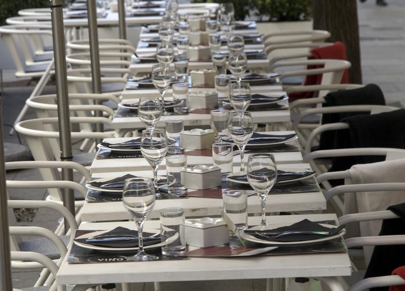 Las terrazas se han apoderado de Madrid en pleno invierno. Esta en la calle Jorge Juan, en el barrio de Salamanca, aprovecha hasta el último metro cuadrado de acera disponible.