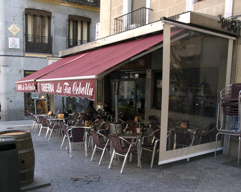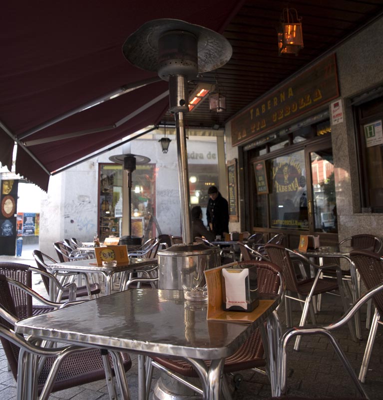 Cubierto por arriba y por los lados, esta terraza de las inmediaciones de la Puerta del Sol espera a los clientes con estufas.