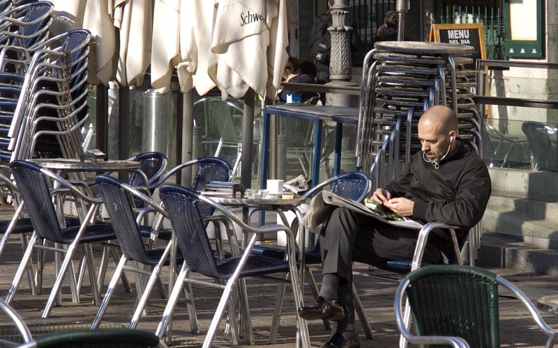 Un fumador se refugia en una terraza al sol mientras se lía un cigarrillo.