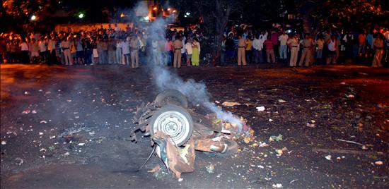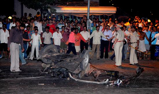 Un agente de seguridad examina los restos de un coche tras la serie de explosiones y tiroteos que ha tenido lugar en varios puntos del sur de la ciudad india de Bombay. (EFE)