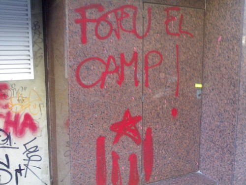 Los radicales de extrema izquierda y catalanista arrojaron botes de pintura roja contra la fachada de la emisora en su campaña de acoso a la COPE.