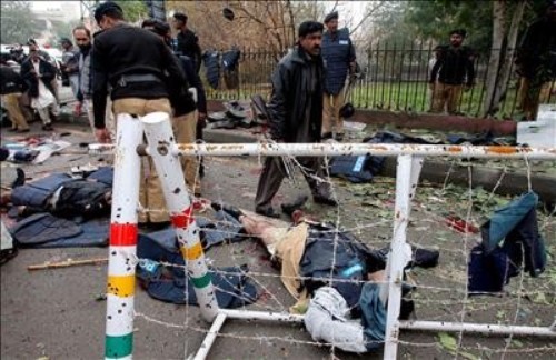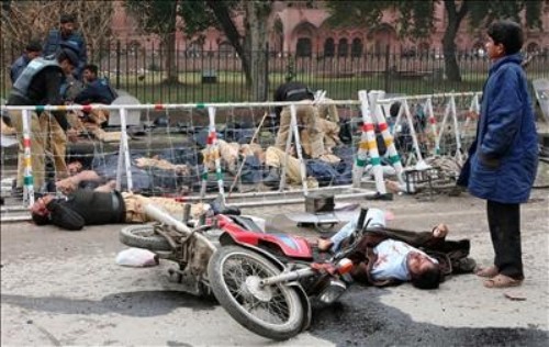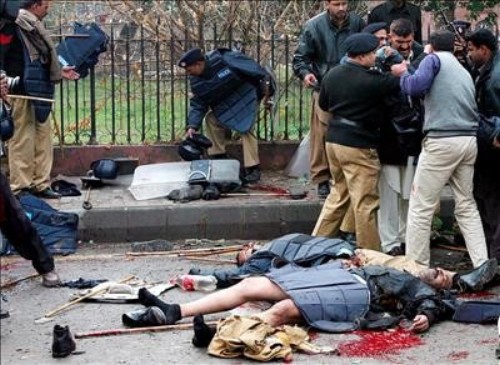 Policías paquistaníes observan los cadáveres de algunos de sus compañeros muertos en un atentado terrorista suicida ante la sede del Tribunal Superior de Lahore. (EFE)