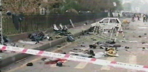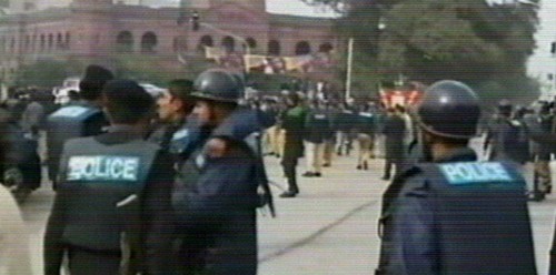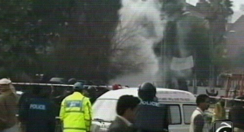 La zona del atentado se encontraba bajo un dispositivo de seguridad por una manifestación de abogados contrarios al régimen del presidente Pervez Musharraf. (Imagen de la televisión)