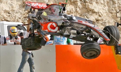 Hamilton observa desde la barrera el estado de su monoplaza tras el accidente que sufrió en los primeros entrenamientos libres. Afortunadamente, el inglés no sufrió daño personal alguno. (EFE)