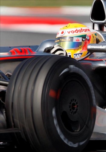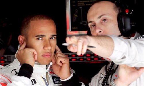 El piloto británico de Fórmula Uno Lewis Hamilton (izq), de la escudería McLaren Mercedes, conversa con su ingeniero de carrera, el británico Phil Prew (dcha), durante la primera sesión de entrenamientos libres en el circuito de Cataluña hoy viernes 25 de abril en Montmeló, cerca de Barcelona (España). EFE
