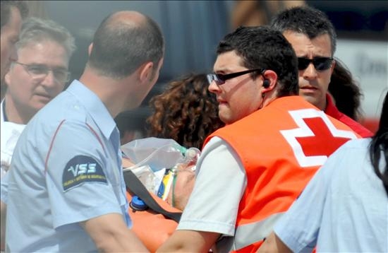 Heikki Kovalainen, de McLaren-Mercedes, es evacuado en camilla tras su grave accidente durante el Gran Premio de España. (EFE)