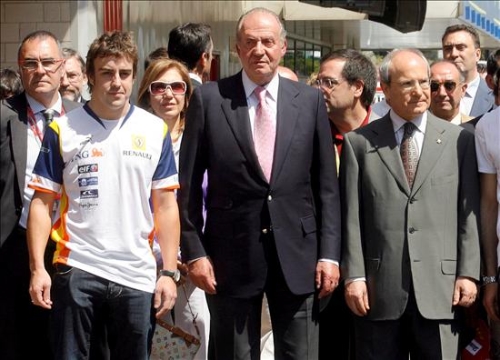 Fernando Alonso camina por la zona de pilotos junto al Rey Juan Carlos y el presidente de la Generalidad de Cataluña, José Montilla. (EFE)