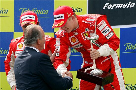 El Rey Juan Carlos entrega a Kimi Raikkonen la copa de ganador del Gran Premio de España en presencia de Felipe Massa, segundo en la carrera. (EFE)