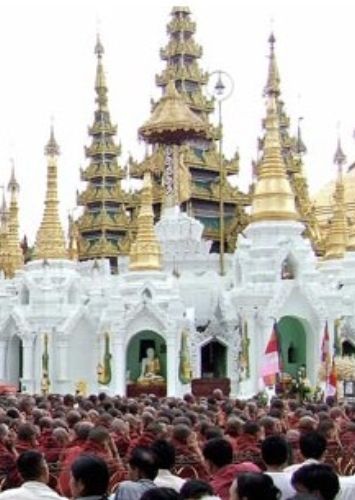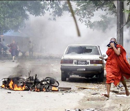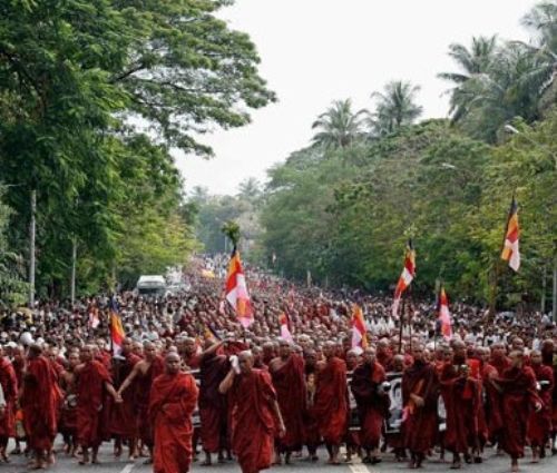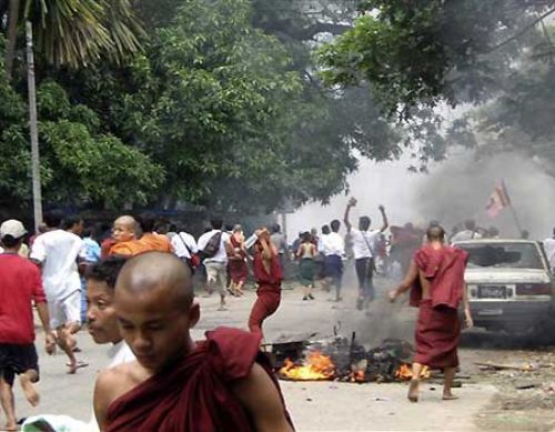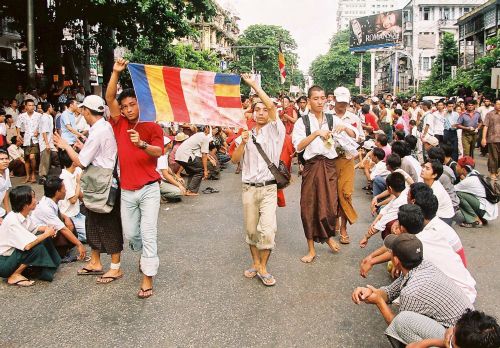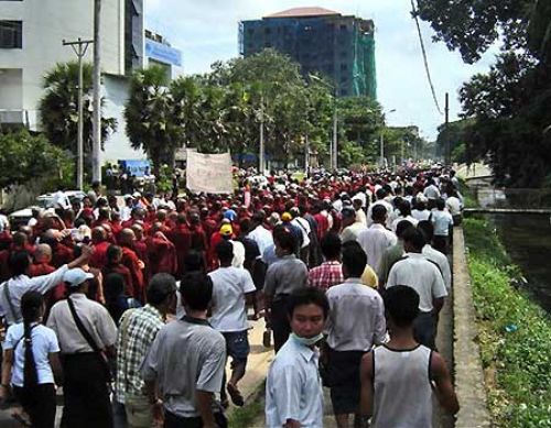 Miles de monjes budista y miembros de la Liga Nacional Democrática encabezan las manifestaciones, duramente reprimidas por la dictadura militar, para exigir una apertura democrática.